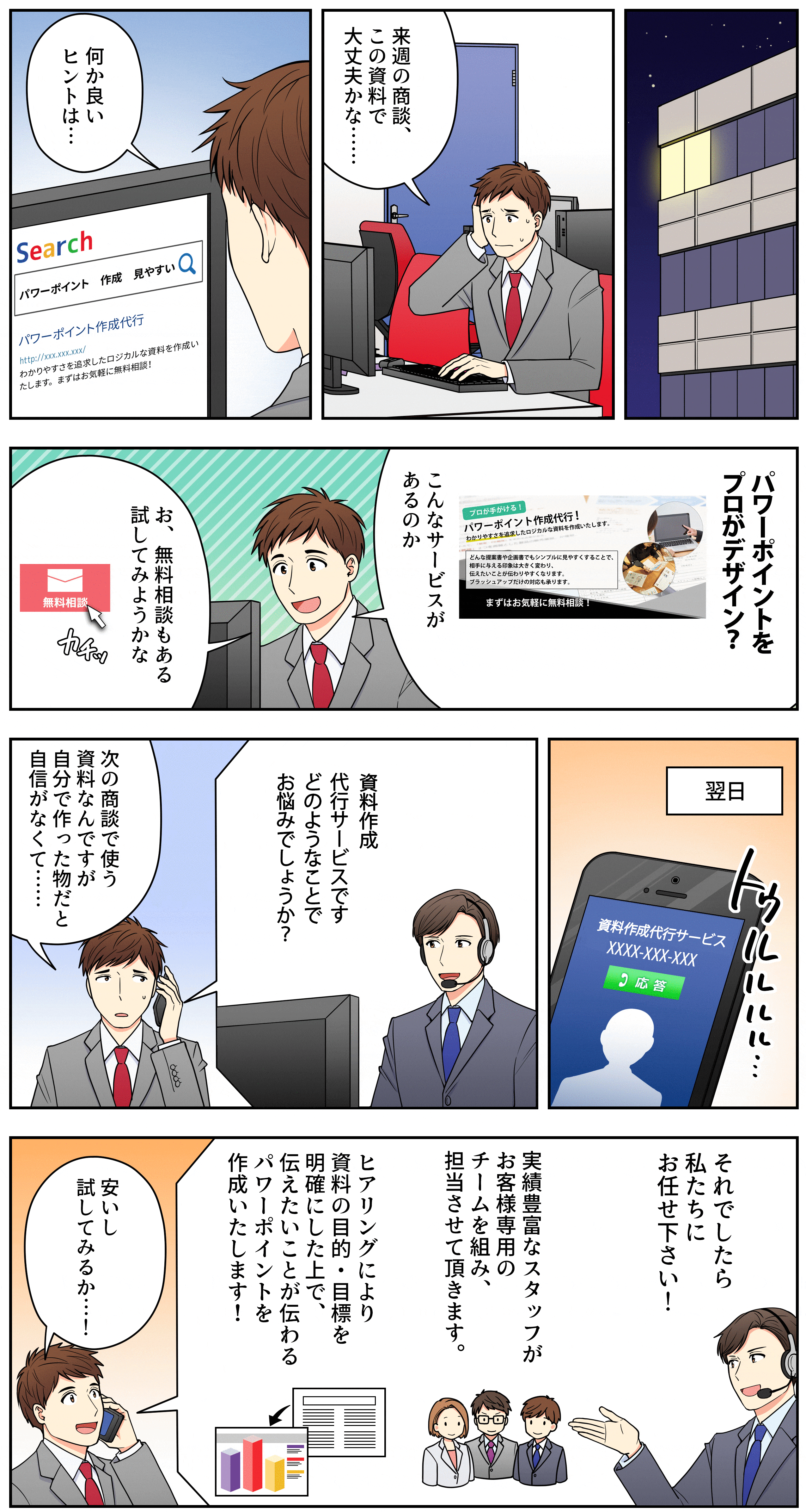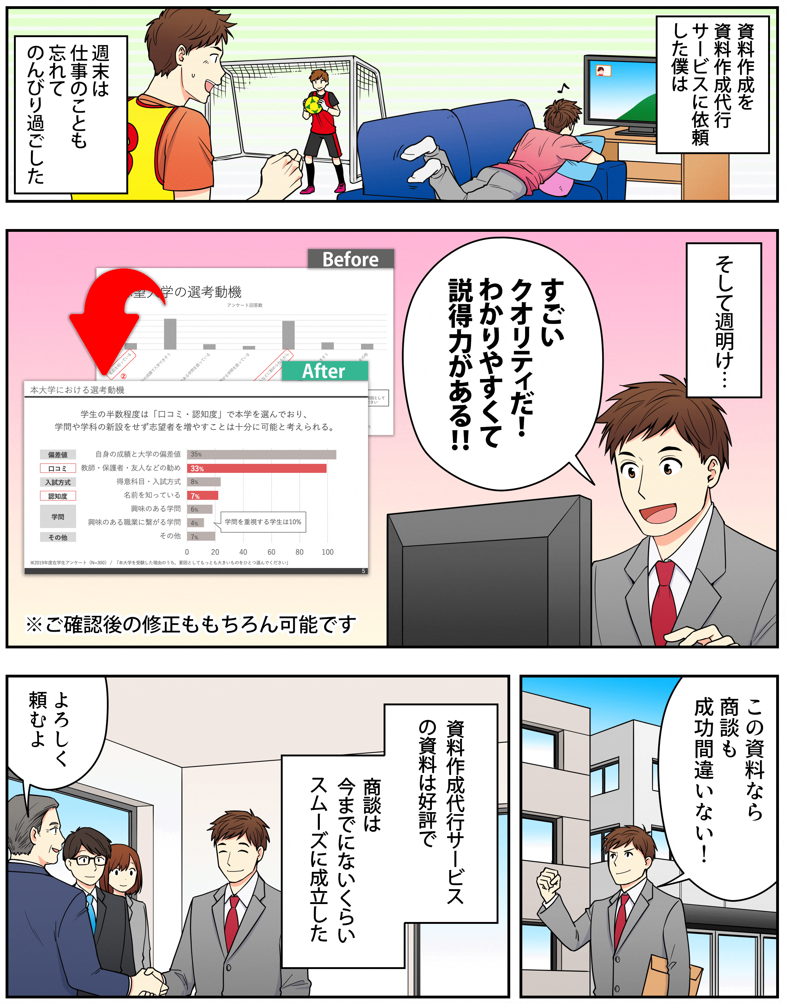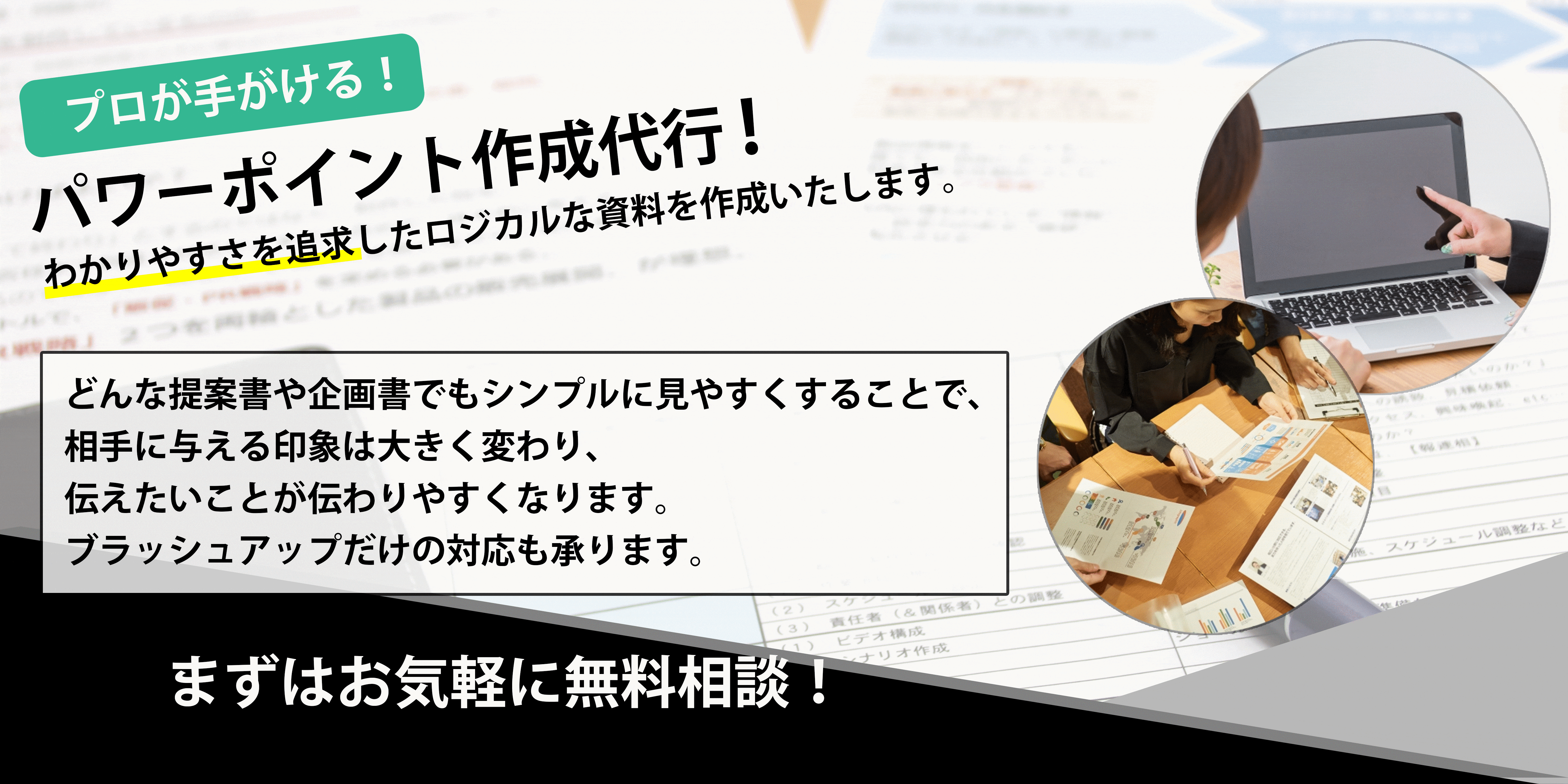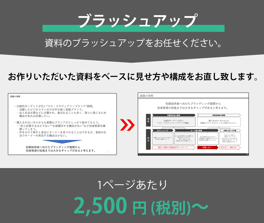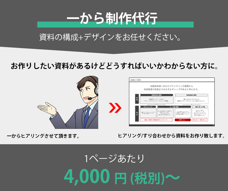 お手元の資料をより見やすくするために添削のみでの対応や、資料構成から文章作成などを含めたすべてお任せいただくことも可能です。